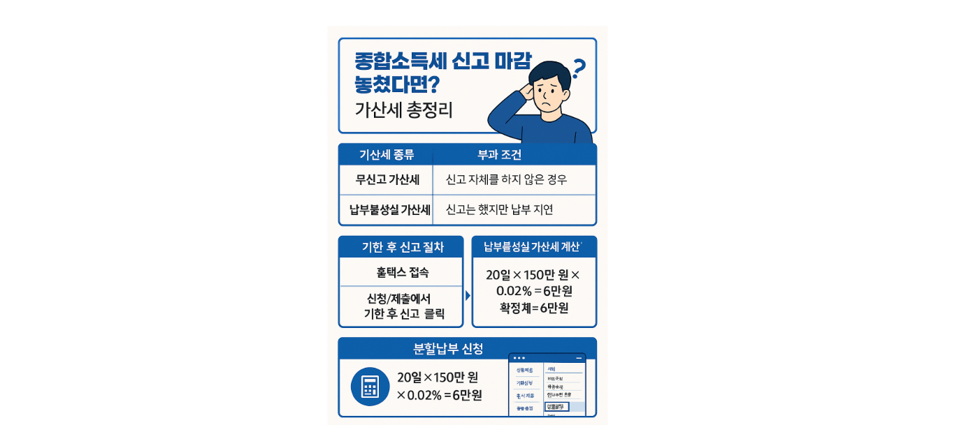 💡 예시: 300만원의 종합소득세를 신고하지 않았다면, 무신고 가산세로 최대 60만원까지 더 내야 할 수도 있습니다.