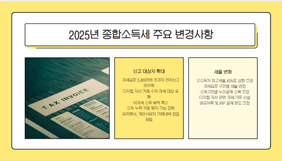 매년 돌아오는 종합소득세 신고 시즌. 하지만 2025 종합소득세는 예년과 조금 다릅니다. 올해는 여러 세법 개정이 적용되면서 신고 대상자나 세율, 공제 항목 등이 바뀌었기 때문입니다.