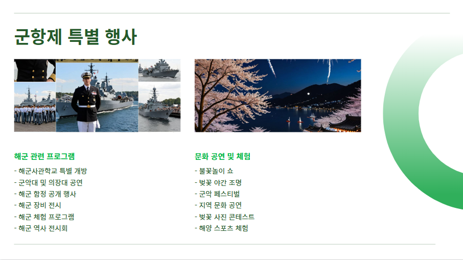 • 해군사관학교 개방: 평소에는 일반인 출입이 금지된 해군사관학교가 축제 기간 동안 특별 개방됩니다.