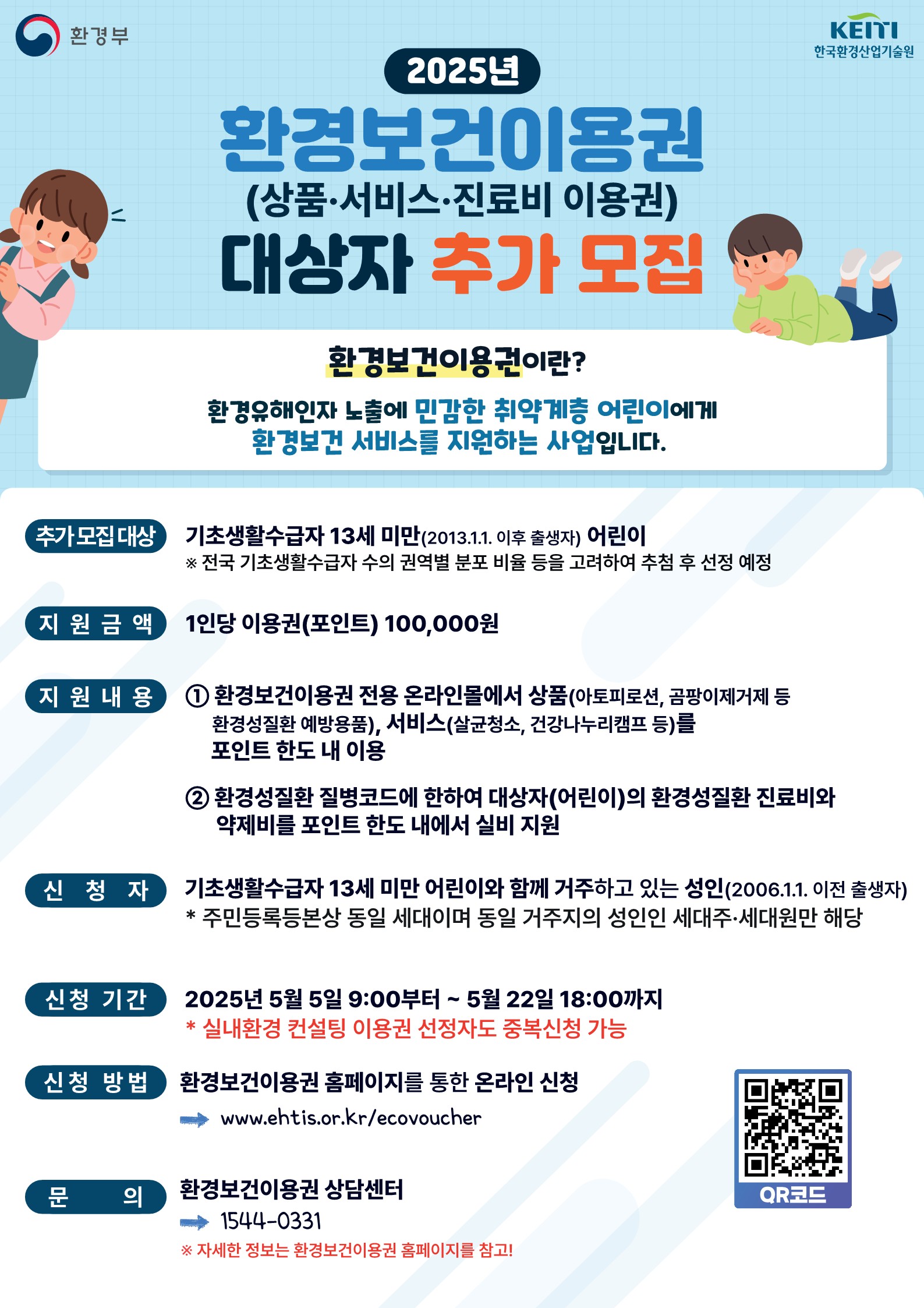 환경성 질환, 들어보셨나요? 아토피 피부염, 천식, 비염, 알레르기 등은 환경오염이나 실내 유해인자에 민감한 사람들에게 자주 나타나는 질환입니다. 특히 면역력이 약한 어린이들은 집 안의 공기 질이나 진드기, 곰팡이 등에도 쉽게 영향을 받게 되지요. 이러한 환경성 질환을 예방하고, 아이들이 더 건강하게 성장할 수 있도록 국가에서 제공하는 제도가 바로 환경보건이용권입니다.