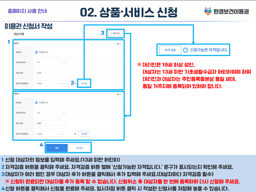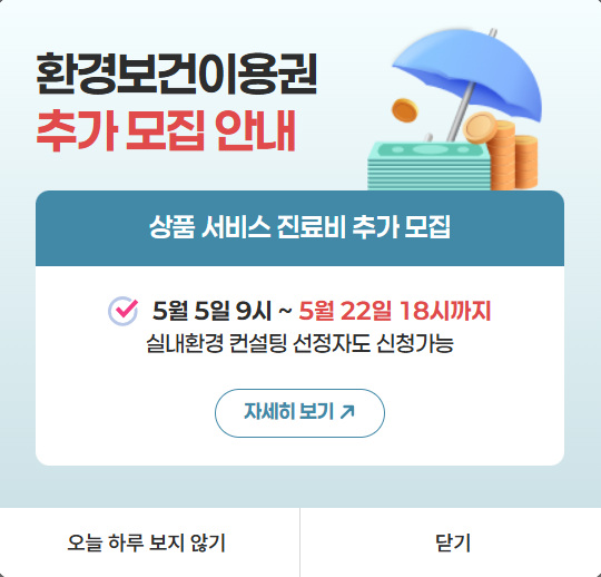 - 환경보건이용권은 예산 소진 시 조기 마감될 수 있으므로 빠르게 접수하시는 것이 유리합니다.