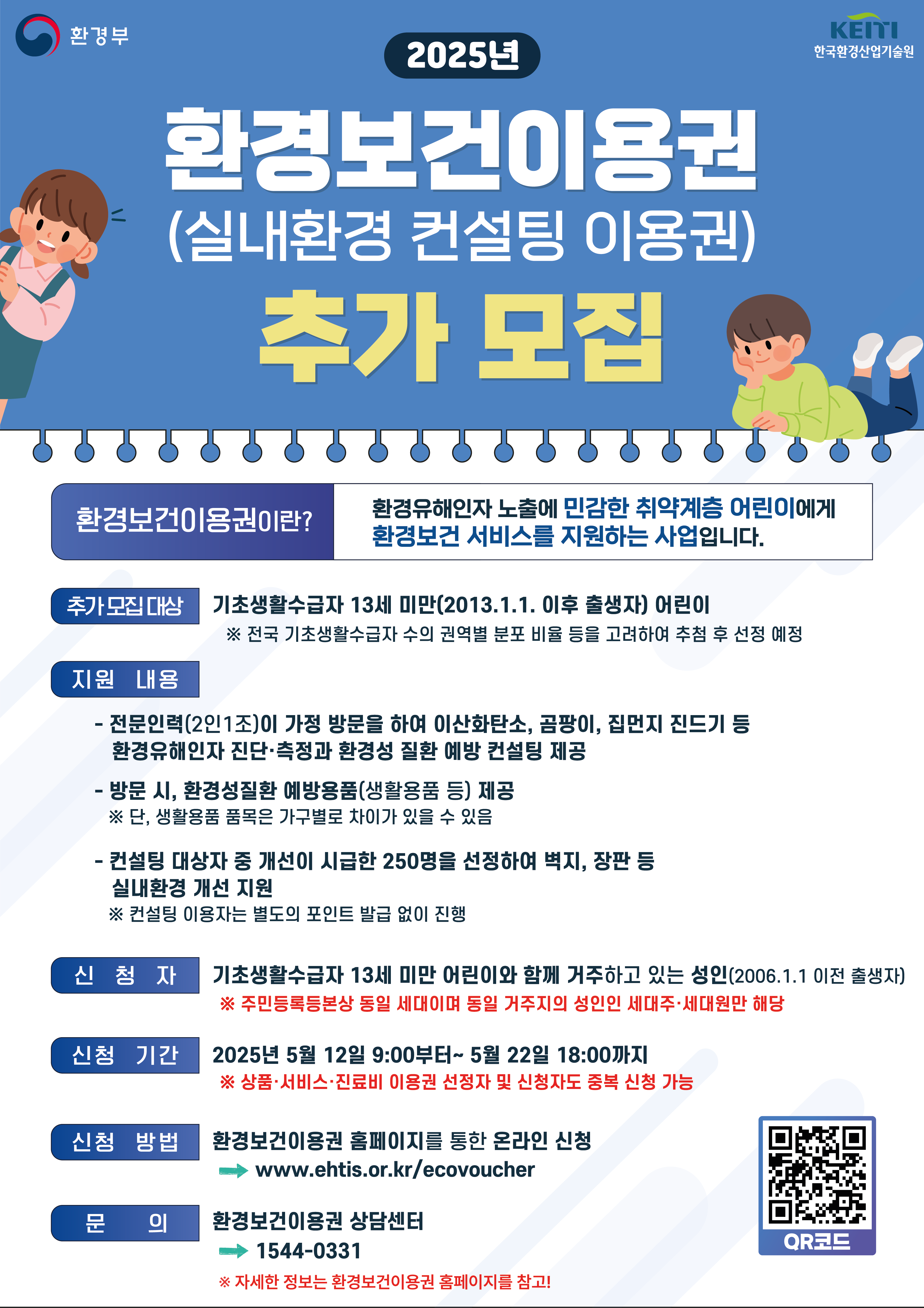 2025년에는 더 많은 취약계층 아이들을 대상으로, 실질적인 혜택이 강화된 환경보건이용권 지원이 시작되었습니다. 이번 글에서는 환경보건이용권의 정의, 대상, 혜택, 신청 방법, 실내환경컨설팅과의 중복 신청 가능 여부까지 꼼꼼하게 정리해 드리겠습니다.