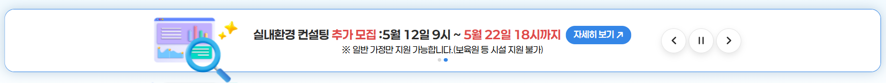 - 메인 페이지에서 ‘이용권 신청’ 또는 ‘실내환경 컨설팅 신청’ 버튼 클릭