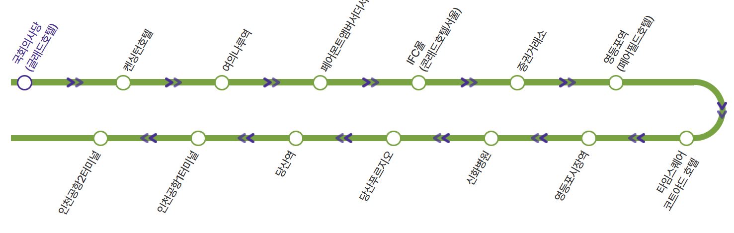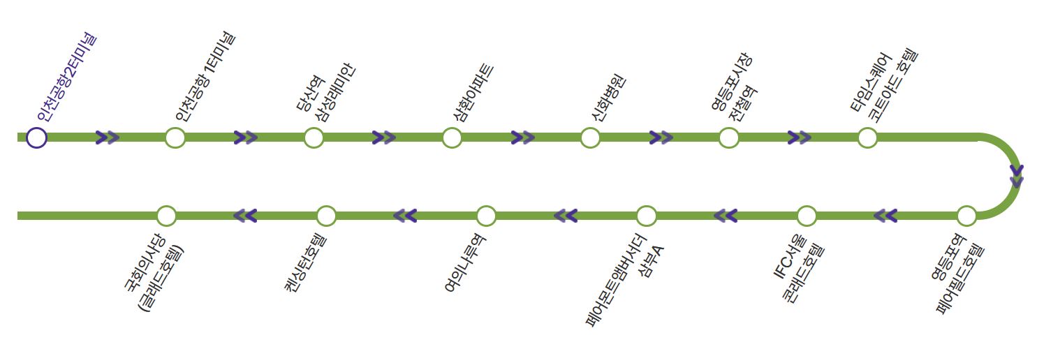 인천공항-당산역(삼성래미안)-삼환아파트-신화병원-영등포시장 전철역-타임스퀘어(코트야드호텔)-영등포역(페어필드호텔)-IFC서울(콘래드호텔)-페어몬트앰버서더(삼부아파트)-여의나루역-켄싱턴호텔-국회의사당(글래드호텔)