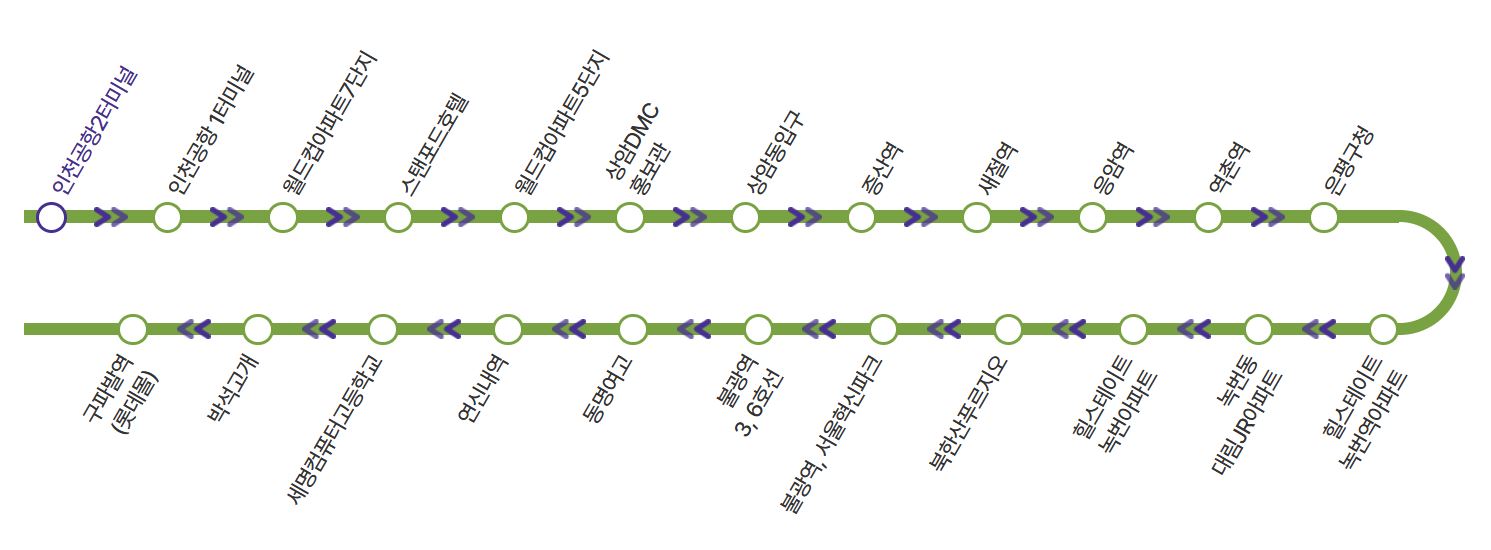 구파발역(롯데몰)-박석고개-세명컴퓨터고등학교-연신내역-동명여고-불광역(3,6호선)-서울혁신파크(불광역)-북한산푸르지오-녹번역-은평구청-역촌역-응암역-새절역-증산역-상암동입구-상암DMC홍보관-월드컵아파트5단지-스탠포드호텔-월드컵아파트7단지-인천공항1터미널-인천공항2터미널