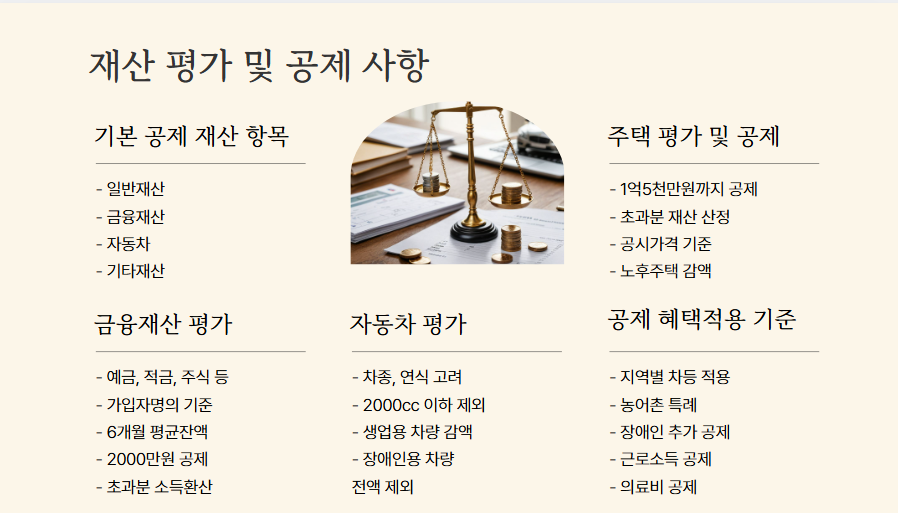소득뿐만 아니라 재산도 고려 대상입니다. 일반적으로 주택, 토지, 예금, 주식, 자동차 등이 포함되며, 일부 재산은 공제 혜택을 받을 수 있습니다.