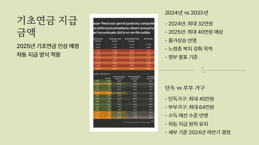 2024년 기준 기초연금 지급액은 최대 32만 원이었지만, 정부는 2025년 40만 원까지 인상 가능성을 발표했습니다. 이는 물가 상승과 노령층 복지 강화를 위한 조치로, 최종 확정 시 상당한 혜택이 될 것으로 보입니다.